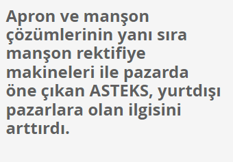 Geride bıraktığı yaklaşık 50 yıllık deneyimi ile tekstil ve matbaa sektörü için çözümler geliştiren ASTEKS, yurtiçinde olduğu kadar yurtdışı pazarlarda da gücünü arttırmaya devam ediyor. Apron ve manşon, matbaa merdaneleri, rotogravür ve flexo’nun yanı sıra rektifiye makinesi ve presler üreten firma, son dönemde tekstil segmentinde ciddi büyüme elde etti.