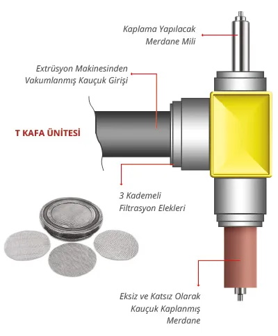 Çıkıştaki “T Kafa” ünitesinde merdane mili üzerine el değmeden eksiz ve katsız olarak kaplanır. Bu işlemler esnasında vakum sistemi ile kauçuk kütlesindeki havalar emilerek merdane bünyesinde hiç hava kabarcığı bırakmadan üretilir.